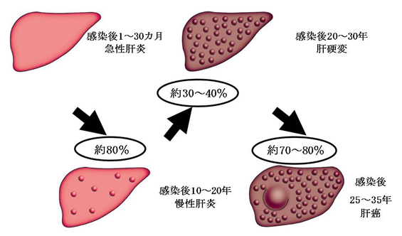 B型肝炎ウイルスに対しては現在、核酸アナログといって内服でウイルスの増殖を抑制し、肝障害を起こらなくする薬を使用することができます。この内服により、ほとんどの場合血液中のウイルスは検出できない程度にまで減少し、肝臓の数値(AST・ALT)は正常化します。すなわち肝障害が治まるわけです。この状態を維持できれば、B型肝炎ウイルスに感染していても肝臓が徐々に悪くなって肝硬変に至る可能性はグンと低くなります。 ただ、B型肝炎に関しては、後述するC型肝炎のように「ウイルスを消す・体の中から駆除する」ことを可能にする薬はまだありません(現在そのような薬の開発が世界中で試みられています)。「飲みだすと一生飲まなければいけなくなる」と言われる患者さんがいますが、ちょうど血圧やコレステロールのお薬のように「いい状態を保つ」、この場合は肝障害のない安定した状態で肝臓を長く保って、自分が生きている期間は肝臓が十分機能している状態を維持するのが治療の基本です。これにより、もし肝がんが発生してしまった場合でも肝臓には十分な治療ができるため、B型肝炎による肝細胞癌の患者さんの生存率は核酸アナログが無かった時代に比べて非常に改善しています。