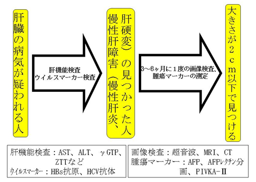 上述のように、肝細胞癌は発生しやすい患者さんをある程度見だすことができます。すなわち慢性肝疾患の患者さんです。ウイルス性肝炎や脂肪肝がある方で、さらに肝硬変により近い方、つまり肝線維化のより進行している方は肝細胞癌が非常にできやすくなっているのです。われわれは肝細胞癌の発見が手遅れにならないように、このような危険のある患者さんをできるだけ多く見出し、そういう患者さんに対しては腫瘍ができた場合の早期発見・早期治療のためより頻繁に肝がんが発生していないかの検査(サーベイランス)を行うようにしています。肝臓の数値が高い方は一度は受診をしていただき、そういう「危険な」状態にないかどうかを一度しっかりと評価してもらうことをお勧めします。
