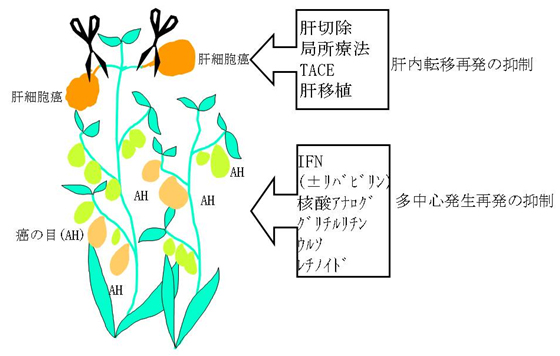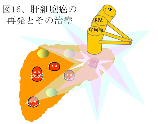 一般的に癌の治療は、手術が第一、手術できなければ抗がん剤治療または放射線治療というのが基本です。ところが肝臓癌では手術・抗癌剤治療以外に、以前からさまざまな効果的な内科治療が行われてきました。今でも肝細胞癌の治療の中で最も根治度の高い(再発しにくい)治療法は切除、すなわち外科手術と考えられます。しかしながら、内科の治療によっても手術に遜色ないほどの治療結果が得られることも少なくありません。