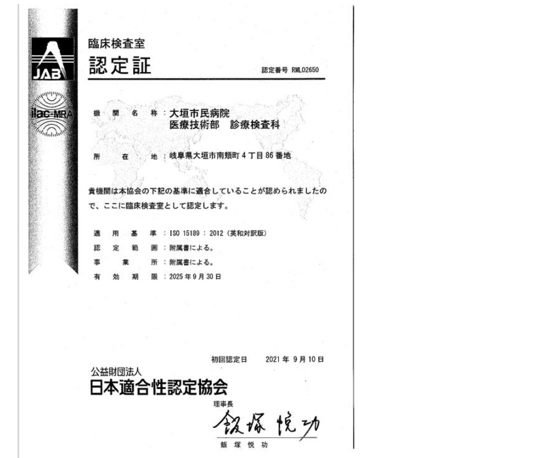 令和3年9月、臨床検査が国際標準化機構の定める国際規格の技術能力に達していると認められ、ISO15189を取得した。