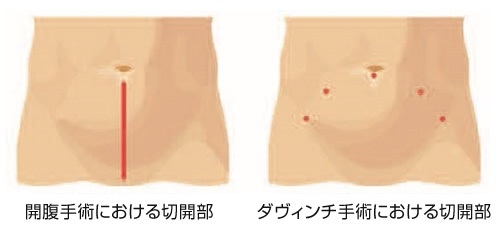 腹部に鉗子を挿入するための8~12mmの穴を数か所開けるだけです。従来の開腹手術と比べ格段に小さく、痛みも少ないです。手術痕もほとんど目立たなくなります。