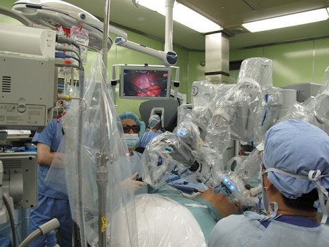 ダヴィンチサージカルシステム(Intuitive Surgical社製da Vinci Surgical System)は腹腔鏡手術を支援する内視鏡下手術支援ロボットです。ロボット手術といっても機械が自動的に手術を行うわけではありません。術者は内視鏡からの3Dのハイビジョン映像を見ながら最大15倍の拡大視野のもと、体内に挿入された手術器具を専用のコントローラーを用いて遠隔操作で動かし手術を行います。手術器具は操作する術者の手を同じように自由自在に動き、また、手ぶれ防止機能を備えているため精密で確実な手術操作が可能です。したがってロボット手術は腹腔鏡手術の進化した形と言えます。