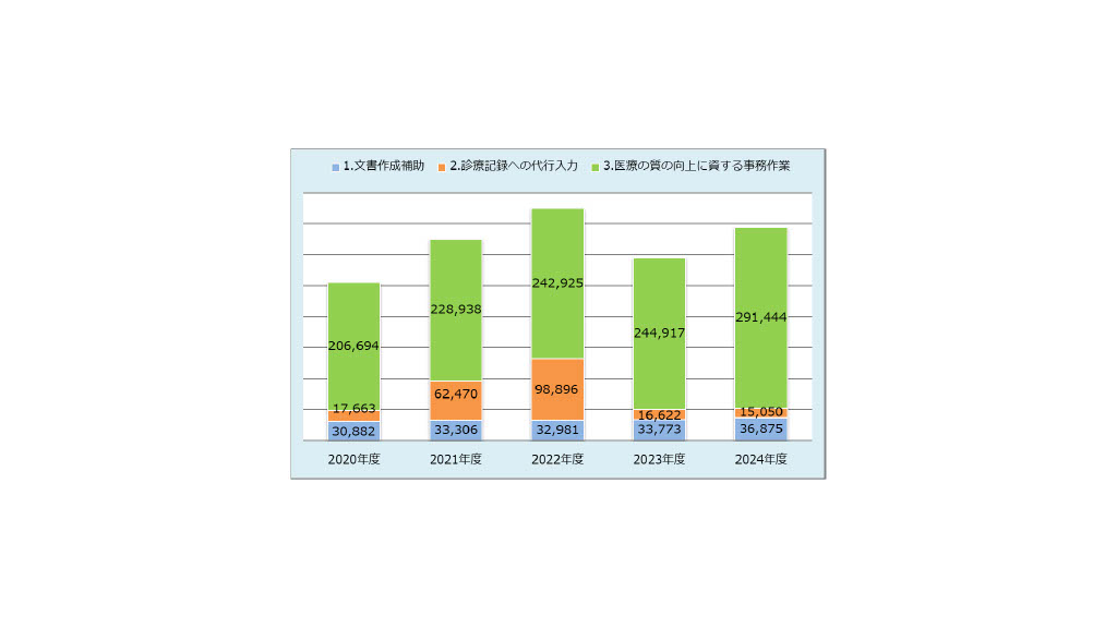当院では、2008年10月に医師の事務作業による負担の軽減を目的に医療クラーク室が設置され、8名の医師事務作業補助者を配置しました。2010年10月より17名に増員し全診療科を補助出来る体制となり、2018年6月にはパート採用を開始し、2025年5月現在、職員18名・会計年度任用職員17名の計35名で、医師の指示や指導に基づいて日々の業務に励んでいます。業務内容は診断書や証明書、介護保険に関する主治医意見書などの文書作成補助、診療に関するデータ整理、院内がん登録の統計・調査に関する事務作業などです。また、退院時サマリーや情報提供書の作成、各種管理料の代行入力やリハビリ代行入力、がん遺伝子パネル検査に関する入力等、更なる業務拡大に努めています。