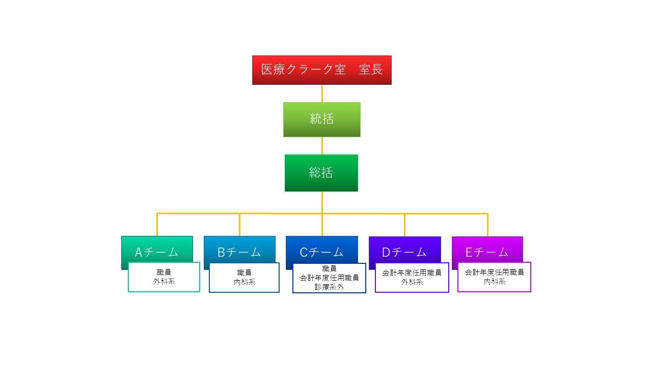 当クラーク室は、5チームで編成され(図1)、各科担当制で担当者不在時はチームでフォローを行っています。また、全員がPHSを携帯し、医師や担当診療科スタッフと常に連絡が可能な状態で業務を行っています。そして、毎月行っている定例会議では、業務報告・連絡・問題事項等を話し合い、クラークの情報共有の場となっています。