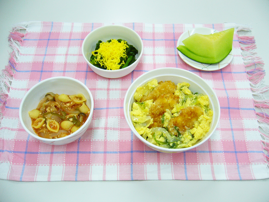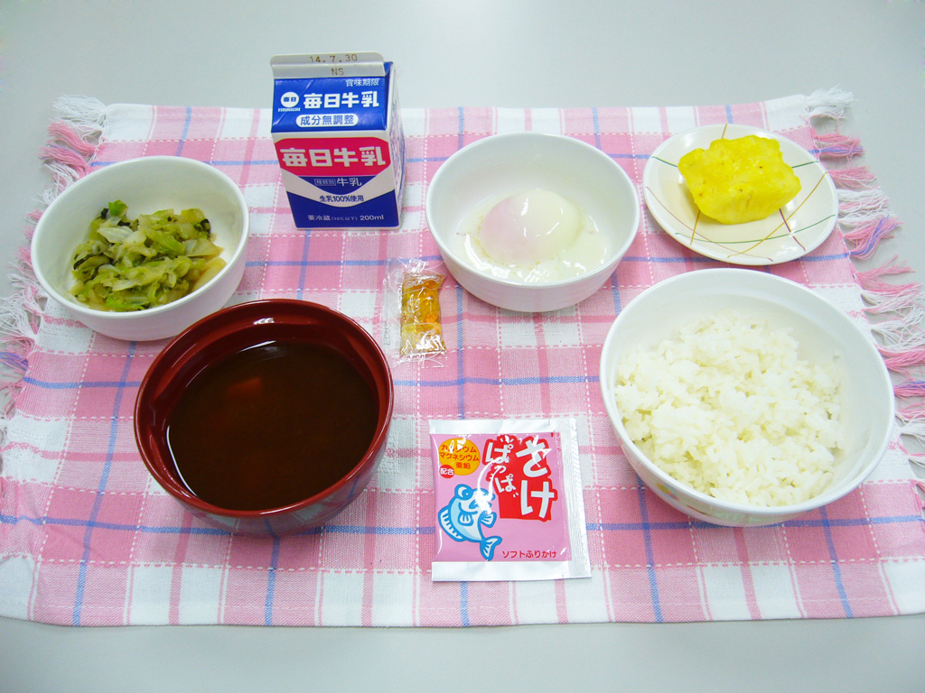 ・ご飯(鮭ふりかけ) ・味噌汁 ・温泉玉子 ・キャベツの磯あえ ・カットフルーツ (パイナップル) ・牛乳