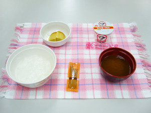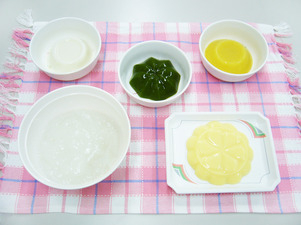 ・全粥ゼリー ・味噌スープゼリー ・おかずゼリー(肉じゃが) ・ヨーグルト ・たいみそ |
