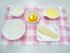 ・全粥ゼリー ・プレーンオムレツ ・白菜のくず煮 ・菜の花煮浸し ・ミルクプリン |