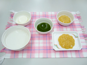 ・全粥ゼリー ・茶わん蒸しゼリー ・里芋の含煮 ・ほうれん草煮浸し ・水分補給ゼリー(りんご味) |