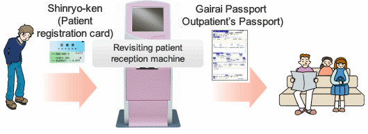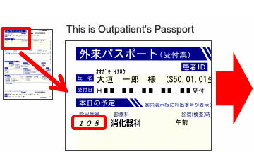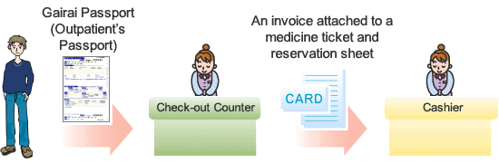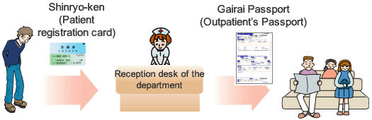 ※Gairai Passport(Outpatient's Passport) is a paper on which your waiting number, information of the department you will consult with and the places where your examinations will take place are recorded. The paper needs to be submitted at the Check-out Counter. Please keep it with you until you have finished paying.
