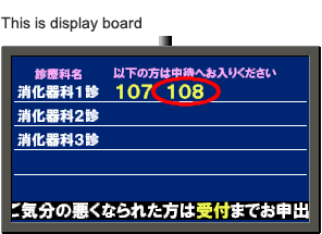 Patients will be called by displaying the patient's waiting number on screen in the waiting area of each department. When your number is displayed on a display board, please come into the consultation room with your Outpatient's Passport.