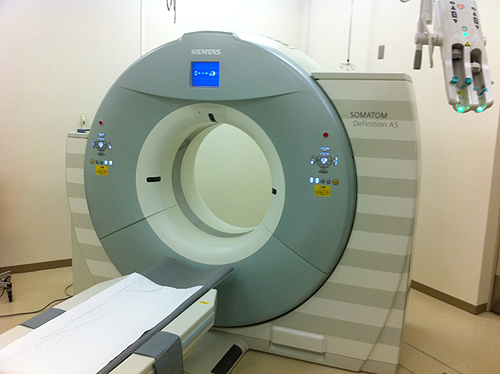 MDCTとは多列検出器CTのことで、X線を受ける検出器が複数列あります。2009年より64列128スライスのCT装置が導入されました。本装置では検出器が64列もあるため、きわめて多量の情報を短時間に得ることができます。さらにZ-sharpテクノロジーという新技術により情報量を倍の128スライスに増やすことができます。短時間に広い範囲を検査することができるため、呼吸を止める時間が大幅に少なくなり、検査が楽になりました。また、精密な画像が得られ、得られた画像情報を再構築することで多方向の断面や、3D(立体)表示が可能となり、小さな病変をも見つけられるようになりました。造影剤を用いた検査では腫瘍などの血流の豊富さや、他の臓器、組織や血管などとの関係がわかり、腫瘍の良性悪性の診断や、腫瘍の進展範囲をより正確に診断することができるようになりました。さらには、その画像処理能力の早さを生かし、リアルタイムに画像を見ながら経皮的肺針生検やマーキング(腫瘍への印付け)にも用いられています。