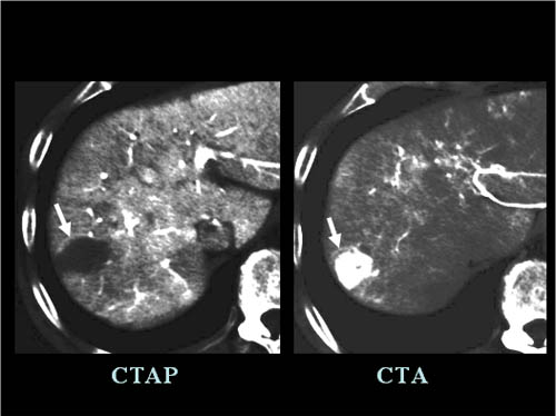 CTA/CTAPとは、肝臓に流れる血管(肝動脈や門脈)に造影剤を注入すると同時にCT検査を行う方法で、肝癌に対する検出能の最も高い検査のひとつです。進行肝癌ではCTAにてよく造影され、CTAPにおいては造影されず抜けて見えます。 早期の段階の肝細胞癌ではCTAでは造影されません。