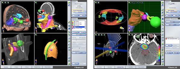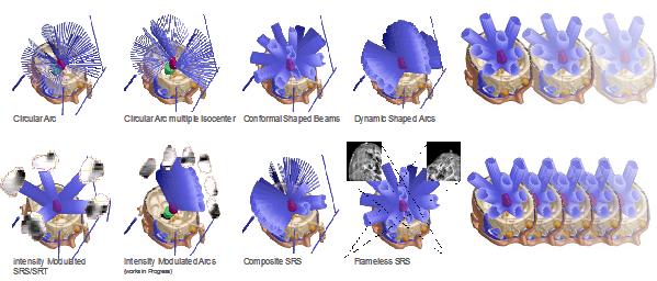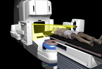 頭部領域における頭蓋内腫瘍(転移性脳腫瘍など)および耳鼻科領域(聴神経腫瘍)、眼科領域(視神経腫瘍)、頭蓋内血管病変(モヤモヤ病、動静脈奇形) には、γ線によるガンマナイフ定位放射線治療が数多く施行されてきましたが、ここ数年、X線を使用した放射線治療装置による定位放射線治療が施行されてい ます。