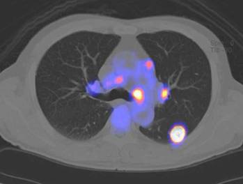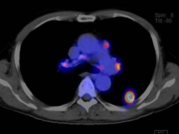 肺がんの患者さんの実際の写真を示します。図4、図5のPET-CT画像で、肺がんが小さいリンパ節に転移している様子が明瞭に示され、治療方針を立てるのに役立ちます。