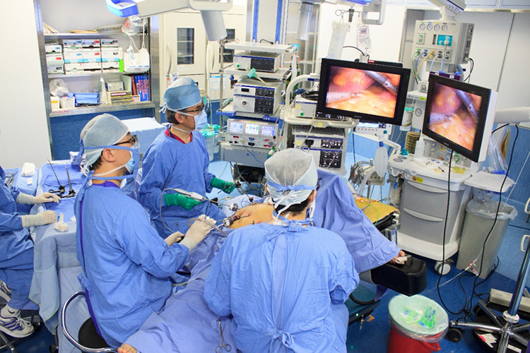 当院外科における低侵襲手術(腹腔鏡下手術)は1990年胆嚢摘出術に端を発します。当時は内科外科合同で8時間をかけて最初の手術を完了した記録があります。帝京大学から見学者も来ていました。今では30分で終わる平易な手術となりましが、手術の歴史を変える大きな一歩でした。その後外科ではヘルニア手術、十二指腸潰瘍穿孔手術に適応を広げますが、本格的なラパ(=腹腔鏡下手術の意味)は2008年からです。年間300例ある大腸がん切除術のうち早期がんを対象にラパを開始し、矢継ぎ早に胃切除、肝切除、膵尾側切除を行っています。現在日本でも少数の施設しか施行されていない、高難度手術である腹腔鏡下膵頭十二指腸切除術を平均5時間半の手術時間で行っています。