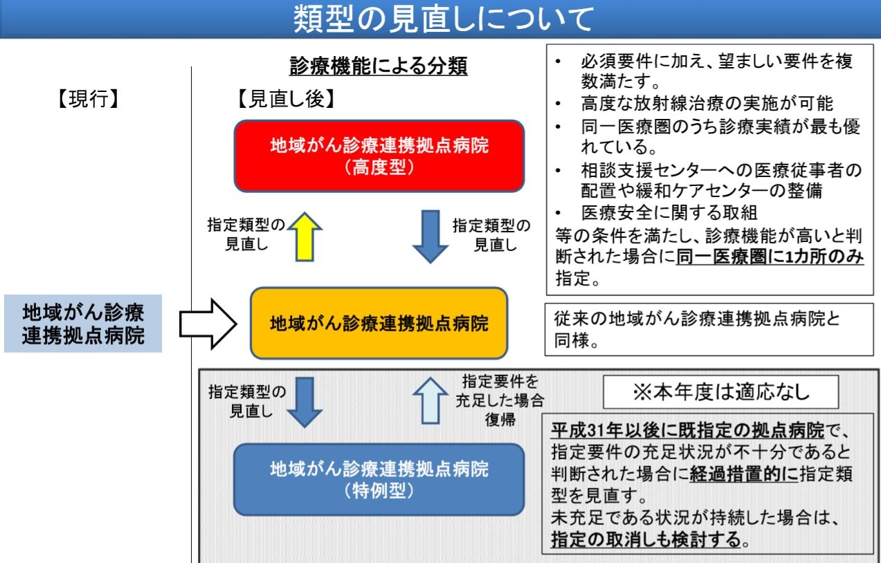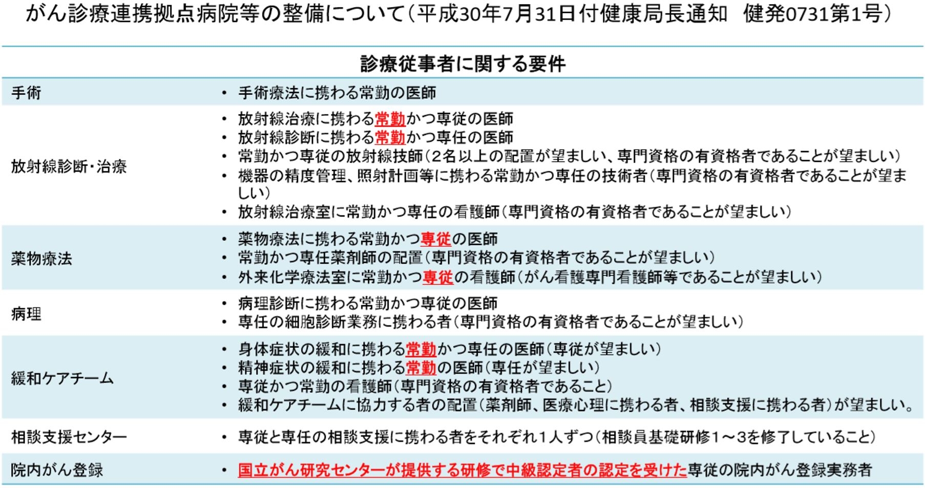2020年4月1日『高度型がん拠点病院』の指定を受けました.厚生労働省は昨年地域がん診療連携拠点病院のなかで特に診療実績が高度で、地域連携を介したがん相談、緩和ケアなどの患者・家族の生活の質を担保する働きに対して各医療圏のがん拠点病院にただ一つ、"高度型"地域がん診療連携拠点病院を設置しました(図1)。全国に約300か所ある地域がん拠点病院に対して"高度型"は47病院のみです。当院は岐阜県初の指定病院となりました。高度型には様々な要件が必須です。がんに携わる職員の配置も決められており (図2) に詳細な基準を示しますが、記載の中で"望ましい"と書かれている条件すべてを満たすことが高度型には必要です。また、がんに対する治療実績として、1)院内がん登録件数500件以上(当院は2649件/年),悪性腫瘍手術件数400件以上(1331件/年),放射線治療件数200人以上(10633件/年),抗がん剤治療件数1000人以上(8283件/年),緩和医療件数50人以上(155件/年)が求められており、当院は全ての条件を余裕を持ってクリアーしていることがわかります(カッコ内は当院の実績を示す)。