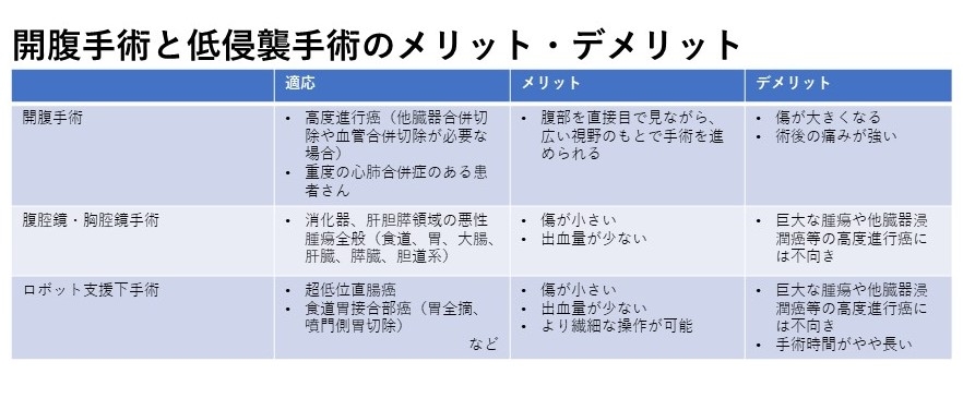 ロボット支援下手術では、これらの精密な手術操作が可能となり、従来の腹腔鏡手術では困難であった超低位直腸癌に対する肛門温存や、進行食道胃接合部癌に対しても低侵襲な手術が可能と考えられます。 |