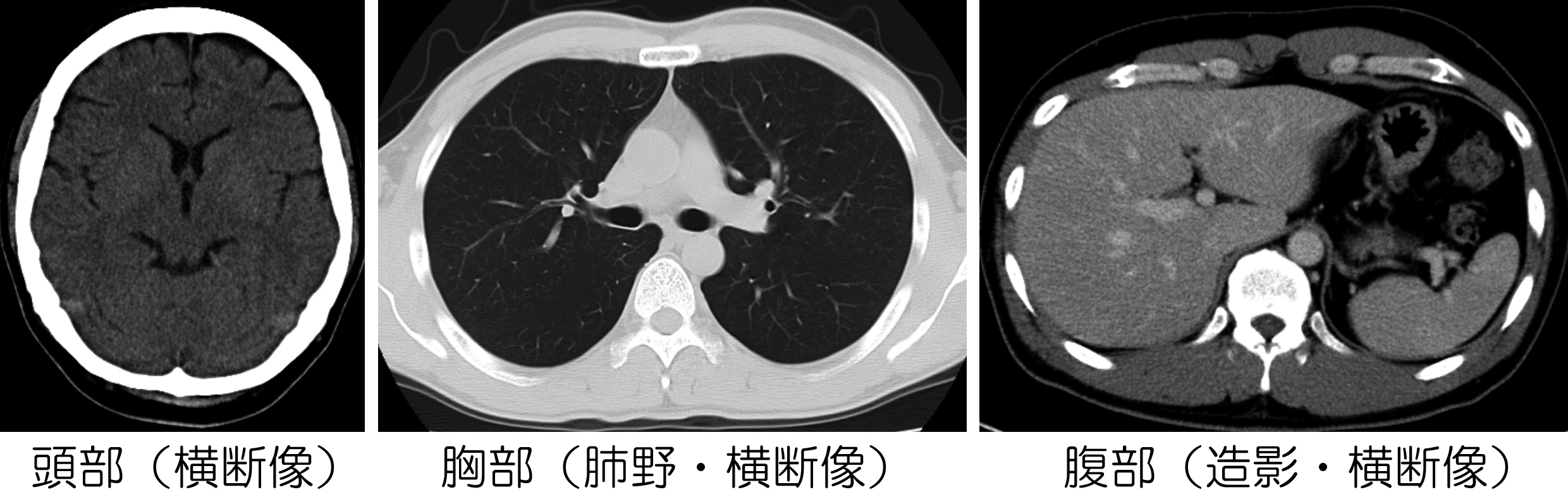 CTとはComputed Tomographyの略で、コンピューター断層撮影といいます。身体にX線を照射し、通過したX線量の差をデータとして集め、コンピューター処理するこ とによって身体の内部を画像化する検査です。最近の装置ではコンピューター処理によって横断像だけではなく、様々な方向の断層像や立体的な三次元画像を作成することもできます。