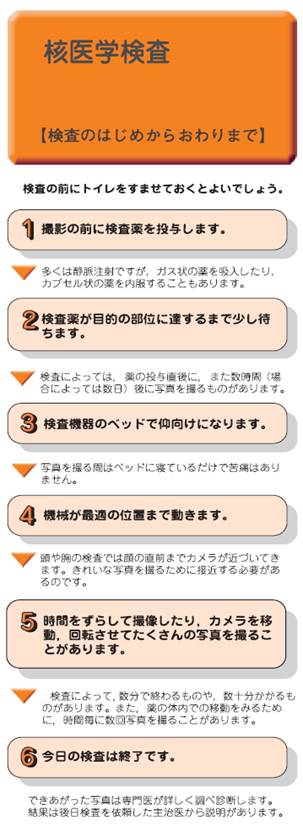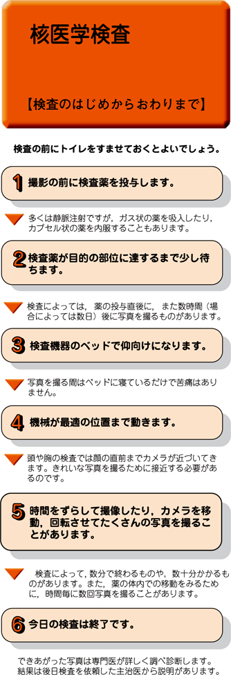 検査は予約制で、使用する薬品をその都度取り寄せておりますので、キャンセルは前日までにお願いいたします。 服装は、心筋血流シンチグラフィで負荷検査を受けられる方は検査着に着替えていただきますが、その他の検査では普段着でかまいません。しかし、検査部位によっては金属類(コイン、時計、眼鏡、鍵、携帯電話、ベルト、カイロ等)をはずしてから検査を受けていただきます。小さめの金属(ズボンのホック等)はそのままでもかまいません。 また、RI検査では目的の部位により検査方法が異なります。そのため検査にかかる時間、注射から検査までの待ち時間等も変わりますのでご注意ください。検査によっては前処置(食事制限や排尿など)が必要になる時もありますのでわからない時はお気軽にお尋ね下さい。