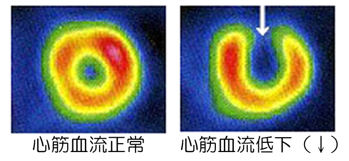 | 右図に心筋血流シンチグラフィ画像の例を示します。血流に依存して心筋に取り込まれた薬から出てくる放射線を用い、体の周りをカメラがゆっくり回転しながら撮影し、心筋血流の断層(SPECT)像を得ることができます。また、目的部位によって全身画像や臓器の静態や動態画像を撮影します。 |