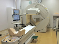 核医学検査は、放射線を放出する放射性同位元素(ラジオアイソトープ)を標識した放射性医薬品を静脈注射などによって体の中に入れ、体内に取り込まれた薬から出る放射線(ガンマ線)を体外から専用のカメラ(ガンマカメラ:右図)で撮影します。その画像によって人体臓器の機能情報や病気を調べる検査です。 ここでは核医学検査の中の単光子放出核種を用いたRI(radioisotope)検査(体外測定)について説明します。RI検査(体外測定)のことをシンチグラフィとも言います。
