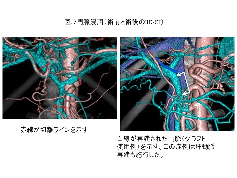 特に、膵臓がんは周囲臓器、血管へ浸潤することが多く、治りにくい癌腫のひとつで、受診時にすでに手術不能なことも多い疾患です。手術は腫瘍の位置によって膵頭十二指腸切除と膵体尾部切除の二つに分けられます。当院の特徴は膵周囲の重要血管を合併切除・再建(つなぎかえ)することで切除不能と言われた患者さんの切除率を向上させています。膵頭十二指腸切除では門脈や肝動脈合併切除を、膵体尾部切除では腹腔動脈合併切除を行っています。更に、膵臓がんの治療成績向上のために、積極的に術前・術後の化学療法を行っています。