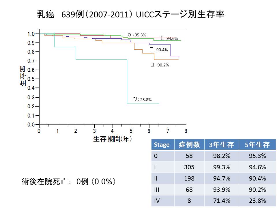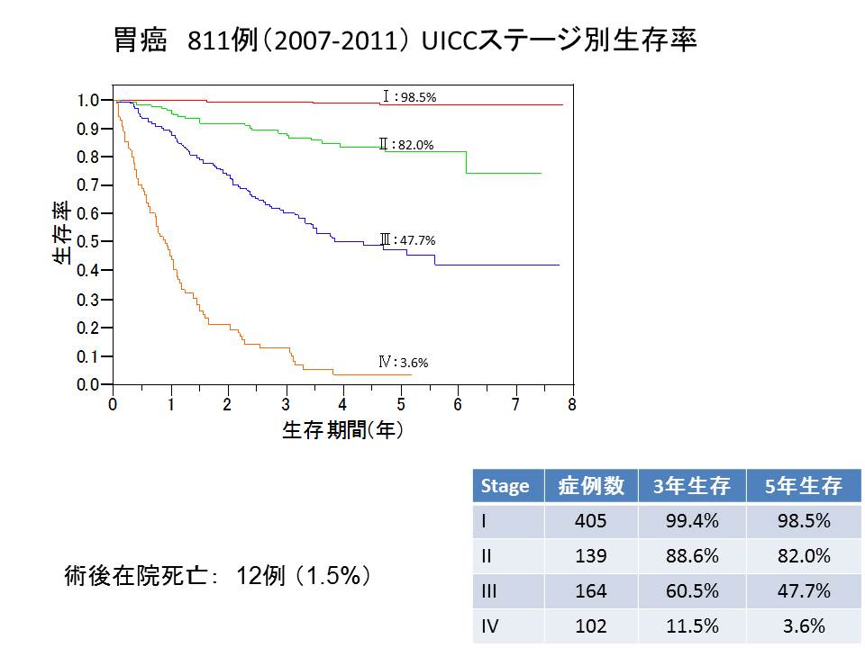 国内のがんセンターを中心に治療成績の公表が行われる中、当外科も主だった癌腫の最新の治療成績をまとめました。Clinical Indicator(あるいはQuality Indicatorともいう)として治療成績を公表することは公正な医療を行う上で必要と考えています。外科では以前からUICC(Union for International Cancer Control)の国際基準のもとでステージ分類(癌の進行度)を行っていて、いわゆる日本独自の癌取扱規約にもとずくステージ分類とは異なるので注意が必要です。また、外科では手術例に限って治療成績をまとめたので、抗がん剤治療、放射線治療、あるいは無治療例などすべてのがんの生存率を反映していないことも留意点です。