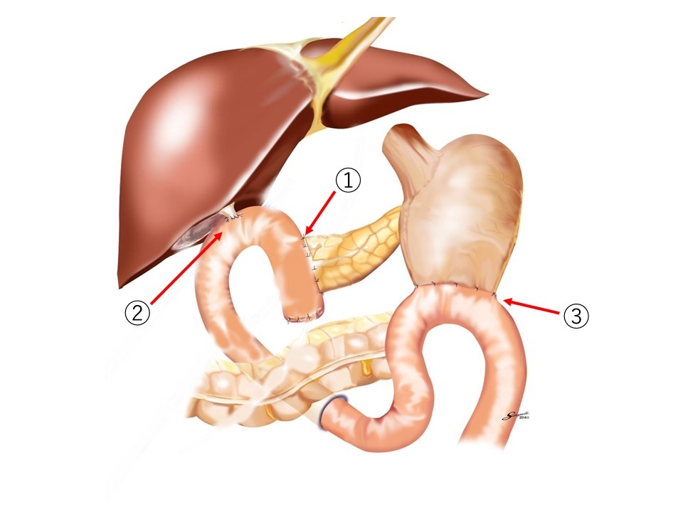 吻合箇所は増えますが、食物の通過は自然に近く、術後のQOL(生活の質)を重視した手術です。
