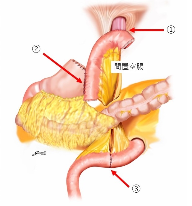 噴門側切除は胃の出口である幽門を温存する術式で、術後の消化機能をより生理的に保つことが可能です。さらに空腸間置再建法を併用することで、術後の逆流性食道炎の予防にも配慮しています。 この再建法では、以下の3つの吻合を行います(図2):