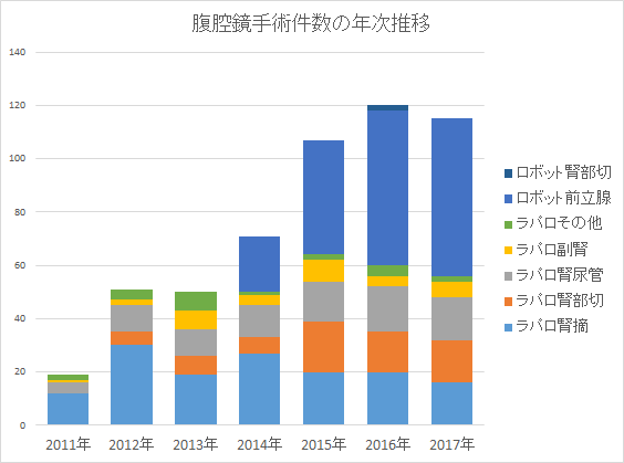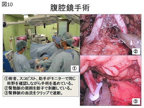 近年、患者さんの体への負担が少ない手術方法や治療法が積極的に取り入れられるようになっています。泌尿器科の分野では、従来は開腹手術で行っていた腎臓や副腎、前立腺の摘出手術が腹腔鏡手術で行われるようになってきました。このような状況の中、当科でも2011年6月より腹腔鏡手術を開始し、副腎腫瘍、腎腫瘍、腎盂・尿管腫瘍などに対し積極的に腹腔鏡手術に取り組んでおります(図10)。2017年末までに約350件の腹腔鏡手術を行ってきました。また、前立腺癌に対しては2014年5月より手術支援ロボットのdaVinci Si(ダヴィンチSi)を用いたロボット支援腹腔鏡下前立腺摘除術を開始し、'からだにやさしい手術をより多くの患者さんに!!'をモットーに、そのすそ野を広げております。
