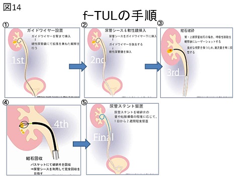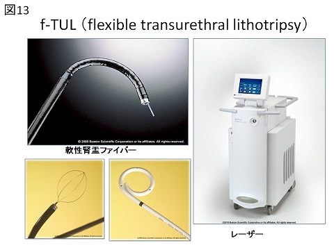(治療)痛みを伴う尿路結石の多くは自然排石されますが、尿路閉塞が高度な症例や、自然排石が困難な大きな結石の場合には、手術治療が必要となります。当院では日帰りで体外衝撃波結石破砕術(ESWL)を行っています。2010年からドルニエ社製のDELTAⅡという新機種が導入され、年間350~400件の治療を行っています(図12)。ESWLでは砕石困難な症例に対しては経尿道的尿管結石破砕術(TUL)や経皮的腎結石破砕術(PNL)を行っております。特に上部尿路の結石に対しては軟性尿管鏡とレーザーを用いて結石を破砕する(f-TUL)も行っています(図13、14)。尿路結石症は感染症を併発すると、稀に敗血症に至ることもあるため、注意が必要です。