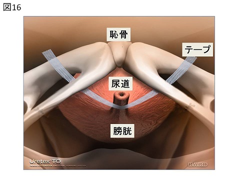 膣から膀胱・子宮などが下垂し、膣外に脱出するものが骨盤内性器脱です(図15)。咳・くしゃみ・運動などで腹圧がかかった時に尿漏れがおこるものが腹圧性尿失禁です。いずれも経産婦婦に多い疾患で、加齢・出産・肥満などが原因で骨盤底筋がゆるむことが原因といわれています。軽症の尿失禁には骨盤底筋トレーニングが有効です。重症の腹圧性尿失禁や骨盤内性器脱には手術治療をおこなっています。人工テープや人工布を用いて補強する手術(TVT・TVM手術)をおこなっています(図16)。経膣操作による手術で入院期間は5日間程度です。