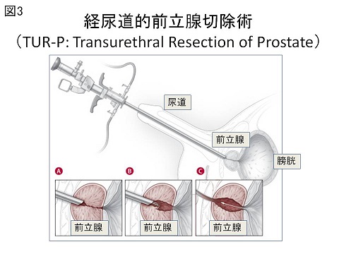 薬物治療を行っても、症状の改善が得られない場合や、血尿、尿路感染、尿閉(尿が膀胱から出せない)を繰り返す場合、あるいは膀胱結石や腎機能障害が発生した場合には手術が必要になることがあります。代表的な術式は経尿道的前立腺切除術(TUR-P: Transurethral Resection of Prostate)です(図3)。これは尿道から内視鏡を挿入し、内視鏡の先端に装着したループ状の電気メスで肥大した前立腺を切除する方法です。また、経尿道的前立腺レーザー核出術(HoLEP:Holmium Laser Enucleation of the Prostate)は内視鏡を尿道から前立腺に通し、 レーザーファイバーを用いてレーザー光を照射し、みかんのような構造になっている前立腺の実の部分(内腺)を皮の部分(外腺)からくり抜くように切除(核出)します。HoLEPは大きな前立腺肥大であっても、出血が少なく、手術が安全に行えます。これらの手術を当院では年間数十例程度施行しており、入院期間は通常約1週間程度です。