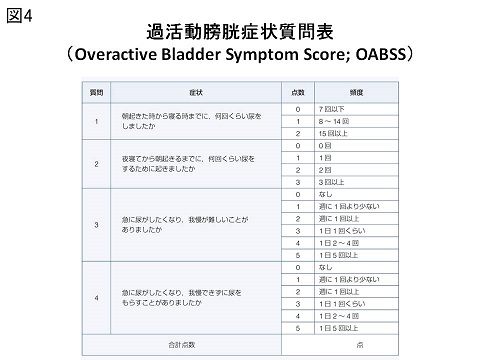 過活動膀胱の診断は、以下の質問票で行います(図4)。質問3の尿意切迫感スコアが2点以上、かつ合計点数が3点以上の場合を過活動膀胱と診断します。ただし、たとえこの質問票で過活動膀胱と診断されても、診察・尿検査・超音波検査などで炎症や癌などの異常がある場合には過活動膀胱ではありません。自己判断は禁物ですので、過活動膀胱かなと思ったら必ず医療機関を受診しましょう。