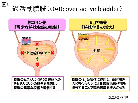 内服治療:抗コリン薬やβ3受容体刺激薬という種類の内服薬で治療します(図5)。その他に膀胱訓練、骨盤底筋体操などの行動療法で良くなる方もいます。男性の過活動膀胱は、前立腺肥大症を伴っていることがあるため、前立腺肥大症に対する治療を同時に行います。