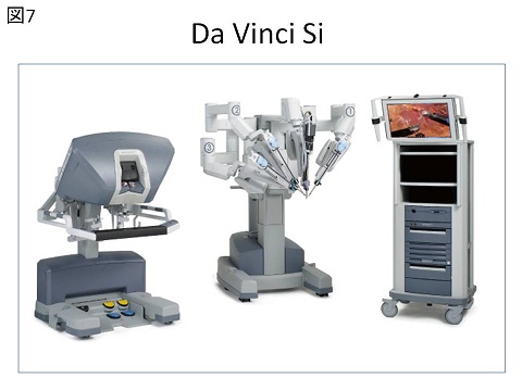 - 手術療法:限局癌(早期癌)が対象。場合によっては局所進行癌に対してもホルモン治療を併用して手術を行うこともあります。合併症の有無などにもよるが、概ね平均余命10年以上の年齢を対象としています。最近ではロボット支援手術が普及してきています。当院でも2014年5月からロボット支援下前立腺全摘除術を行っています(図7)。ロボット手術の詳細についてはロボット支援手術のホームページをご覧ください。