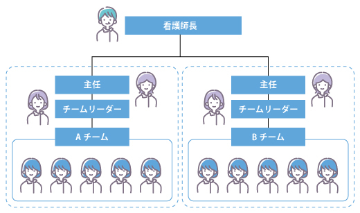 チームは主任・チームリーダー・メンバーで構成します。構成員は一定期間(原則1年間)固定し、チームは年間目標を持って活動していきます。