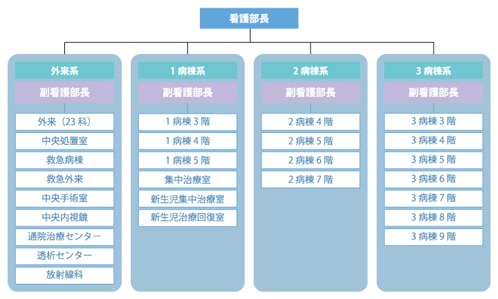 看護活動を円滑に行うため、病棟・外来系だけでなく他部門にも看護師を配置しています。