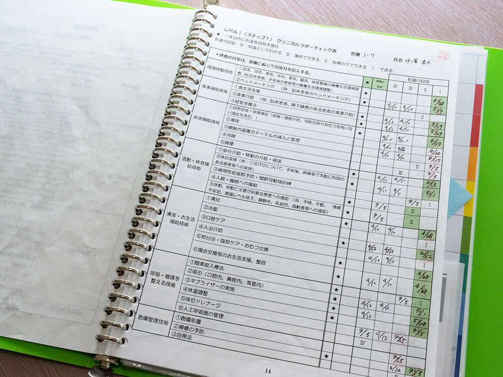 新人看護職員は自己の成長ファイルを綴ったファイルを持ち年間計画に沿った研修を受けます。現場ではチーム支援によって指導を行ない、成長を見守ります。