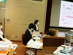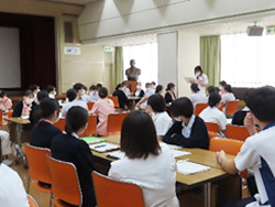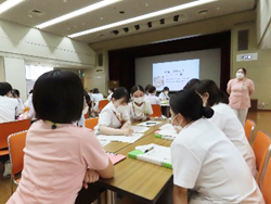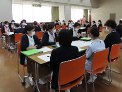 報告・連絡・相談の研修を行います。5~6人のグループに別れ、演習します。