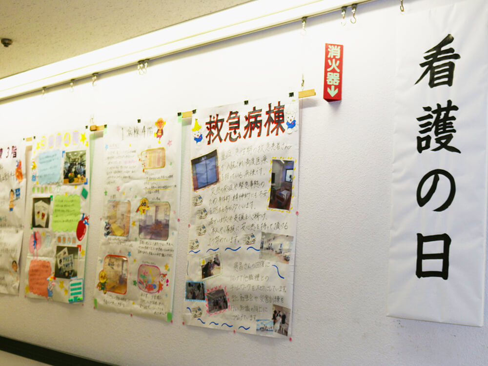 看護の日を中心に1ケ月間、病院中央廊下に各部署の日頃の活動を貼りだします。