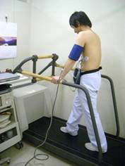 ベルトコンベアのような機械の上を歩きながら、心電図・血圧の変化、自覚症状の有無をみる検査です。
