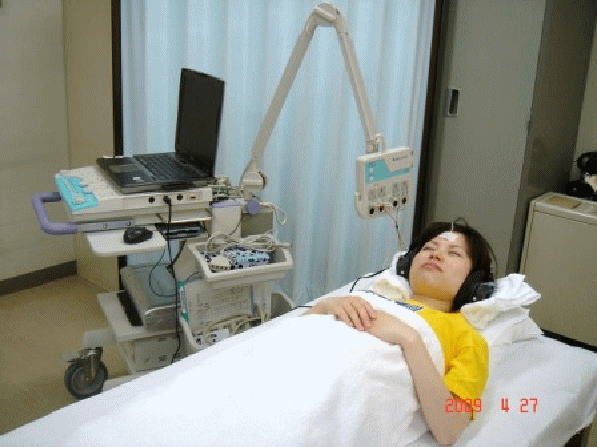 頭に電極をつけて、ヘッドホンから聞こえる音を聞いていただきます。痛みはありません。 検査時間30分~1時間 |