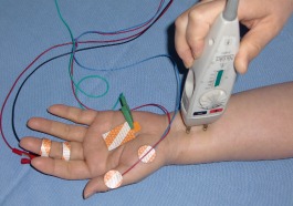 上肢または下肢の感覚神経に、電気的あるいは機械的な刺激を与えることによって誘発される電位で、末梢神経から脳幹、大脳皮質までの間に機能障害がないかを調べる検査です。図のようにアースと刺激電極を装着し電気刺激をします。刺激部位は手と足です。 |