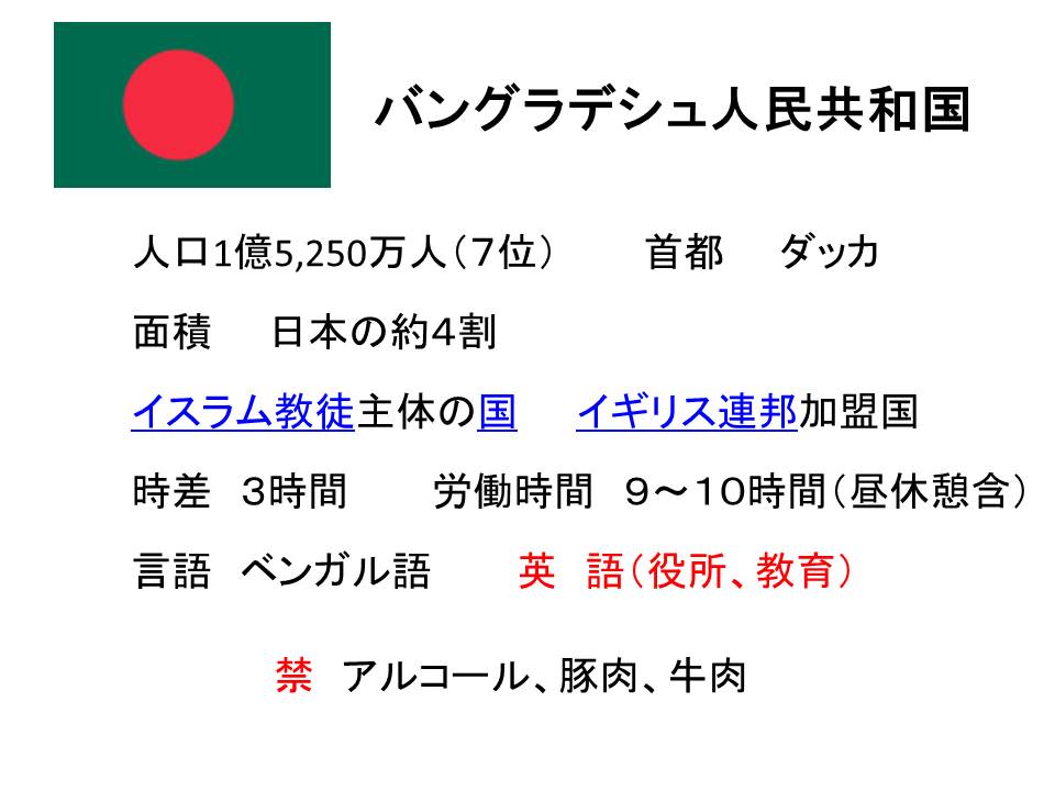 発展途上国バングラディシュは、人口1億5,250万人、面積は日本の4割であり、都市国家除けば世界一人口密度の高い国です。首都ダッカは、ヒトヒト、リキシャ(自転車で人を乗せたカーゴを引く)、オート三輪車、バス、乗用車に溢れかえり、またオールドダッカではおとぎ話のような馬車も通り、近世から現代の乗り物が一同する世界です。公用語はベンガル語ですが、イギリス連邦加盟国(元英国領)であることから、官公庁や教育機関では英語を使われており、事実上の公用語です。