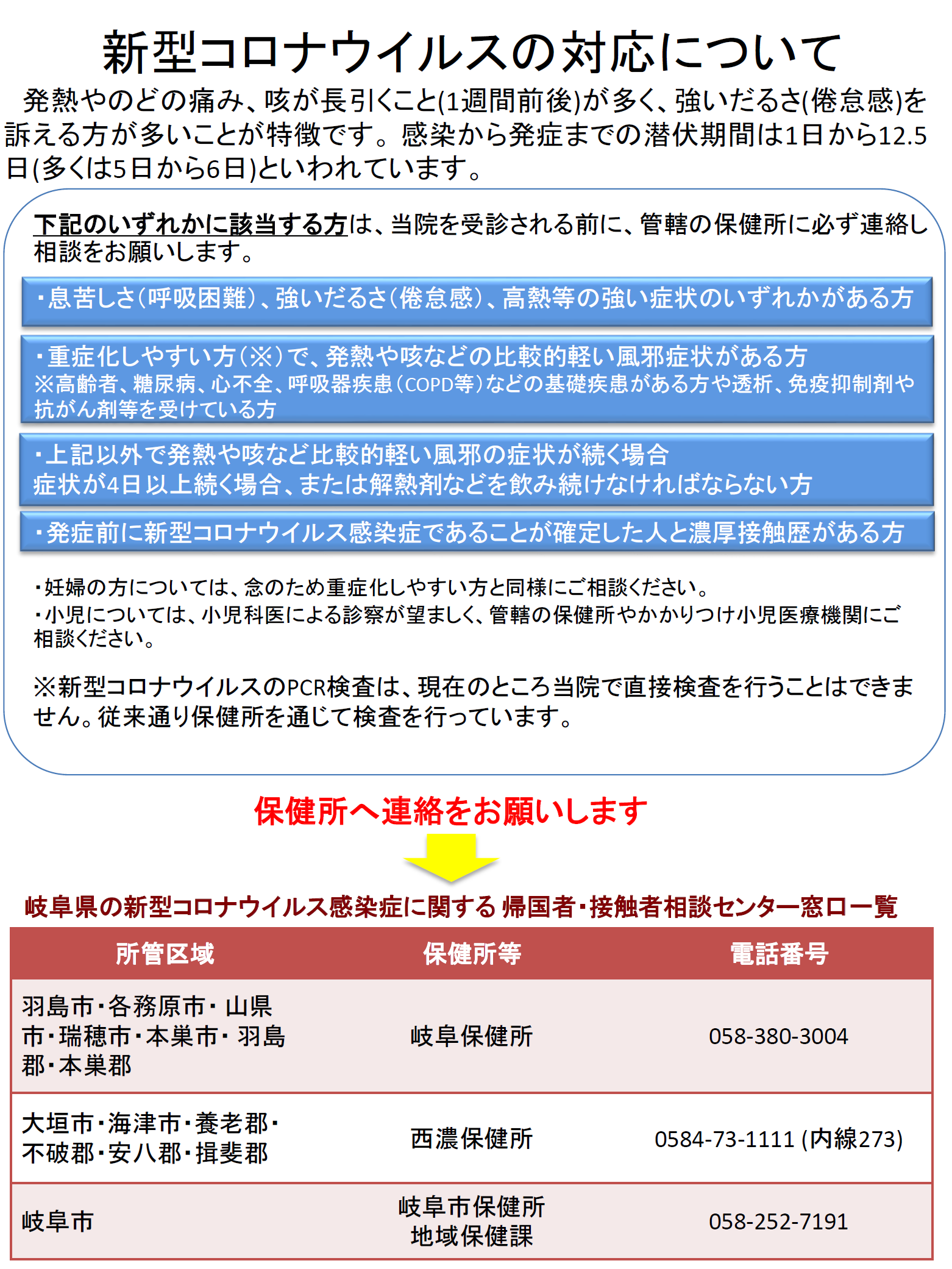 2020年1月わが国でも新型コロナ感染者が報告され、医療サイドとしては2月以降厳戒態勢のもと患者管理、職員管理を行ってまいりました。院内感染はひとたび起こると長期間に渡って病院機能が減退・縮小するとともに市民の皆さんにも多大な影響を及ぼします。特に当院のような西濃地区全域をカバーする基幹病院では影響は計り知れません。岐阜県では2月25日に第一例目が発生して以来、岐阜市を中心に感染が拡大し、特に3月下旬から4月上旬にかけてクラスター発生が相次ぎ一気に150例まで患者が増加しました。ただ、その後はみなさん一人一人の自粛と 4月7日の緊急事態宣言が相まって5月以降は発生が皆無に等しくなりました。今後も病院内でのマスクの着用、手洗いの励行、面会の制限(現在は1家族1人に限定)など、ご協力をお願いいたします。また、午前中の外来混雑(採血室など)を緩和するため、主治医と相談の上午後外来(午後1時から4時)の活用をお願いいたします。