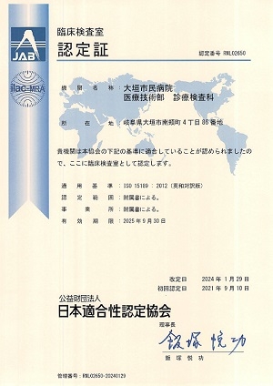 当院の臨床検査が国際規格の技術能力に達していると認められ、2021年9月10日に国際標準化機構(International Organization for Standardization)よりISO15189の認定が授与されました。その後のサーベイランスにてISO15189:2012(英和対訳版)に適合していることが認められました(2024年1月29日改訂)。認定対象検査は、生化学検査、免疫検査、一般検査、血液検査、微生物検査、病理細胞検査、生理機能検査、輸血検査です。