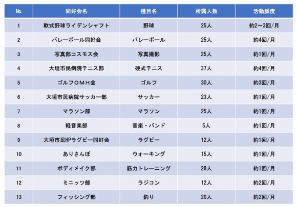 当院には以下に示す同好会が存在しています。自主的な運営が基本ですが病院からも活動費が支給されています。参加は自由なので興味のある方は見学を兼ねてぜひ参加してみてください。(詳細は庶務課にご連絡ください)