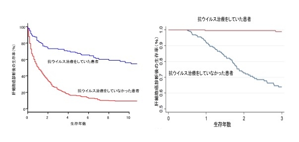 図4(左):抗ウイルス治療の有無による肝細胞癌患者の生存率の差(B型肝炎)