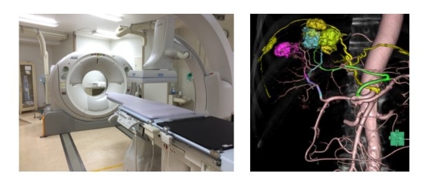 肝動脈化学塞栓術は、肝細胞癌に血液を送っている血管をカテーテル検査で見つけ出し、できるだけ近くまでカテーテルを送って抗がん剤を流した後に血管をつめる(塞栓する)治療法です。癌に血液を送っている血管がなかなか見つからなかったり、血液を送っている血管が複数あって治療に苦労することがありますが、当院ではIVR-CTという非常に高度な血管造影・CT装置(図7)を用いて血管の立体画像を作り、より早く治療の必要な血管を見つけ出して治療していくことを心がけています(図8)。